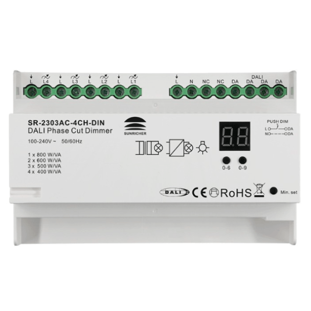 Sunricher SR-2303AC-4CH-DIN 4-Channel DIN Rail Mount DALI-2 Controlled AC Phase Cut (TRIAC) Dimmer